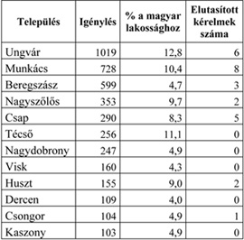 A kérelmek több mint felét a 100-nál több igénylést benyújtó települések adták. (Lásd a táblázatot.)